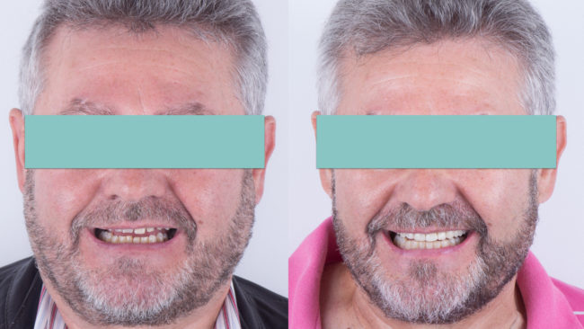 Rehabilitación oral Paciente de 71 años que acude para rehabilitación oral a nuestra clínica dental de Castellón con múltiples pérdidas dentales y desgastes. No podía comer y estaba cansado de su apariencia. Rehabilitación con coronas e implantes dentales. Paciente satisfecho con el resultado final. Bonita estética y sin problemas para masticar.